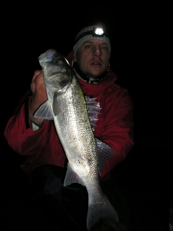 Soon after, my 'big fish' rod bucked over and I struck into something a bit better. Dave was waiting in anticipation on the surf line as I slid a bar of silver up the shingle in the shape of a 3lb 8oz bass. This fish was extremely lean and sporting a 'healed' bite mark near the anal fin. I would have expected this bass to be well over 4lb in top condition.....it looked more like a pike!